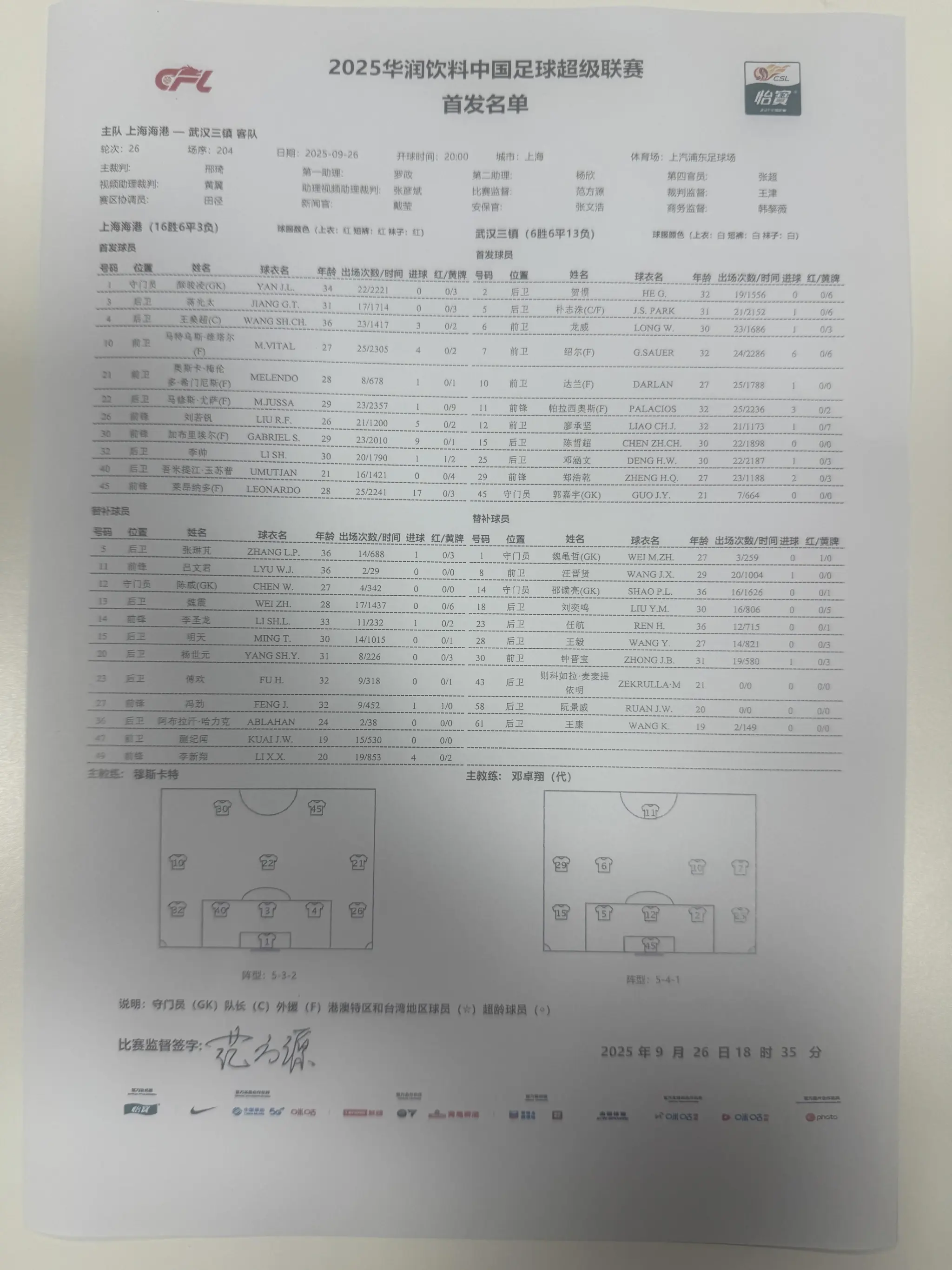 武汉三镇首发:2-贺惯、5-朴志洙、6-龙威、7-绍尔、10-达兰、11-帕拉西奥斯、12-廖承坚、15-陈哲超、25-邓涵文、29-郑浩乾、45-郭嘉宇